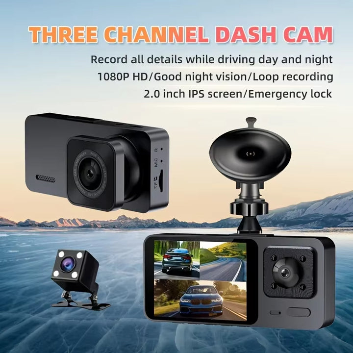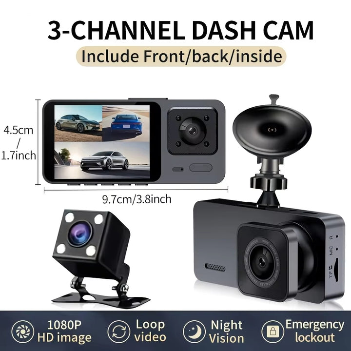 1080P Triple Lens Dash Cam, 3-Channel Front Rear Inside Car Camera, Night Vision, Loop Recording, Parking Mode, 360° Vehicle Monitoring, Wide Angle, Motion Detection, 2 Inch IPS Screen