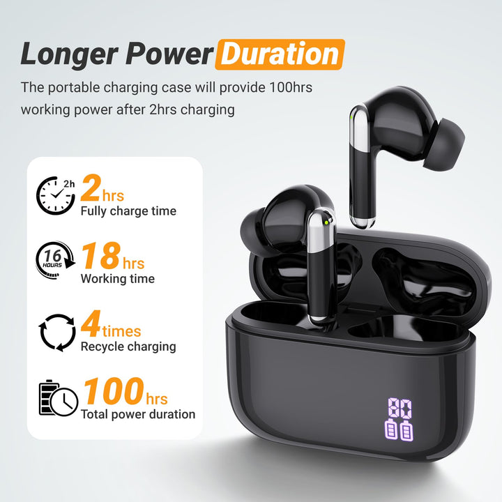 Disfrutar 18 horas por carga + 4 cargos adicionales (100+ horas) desde el Estuche de carga ultraportátil . Total 118+ horas Uso: perfecto para viajar. Características carga rápida y encendido/apagado automático Cuando está acoplado. -