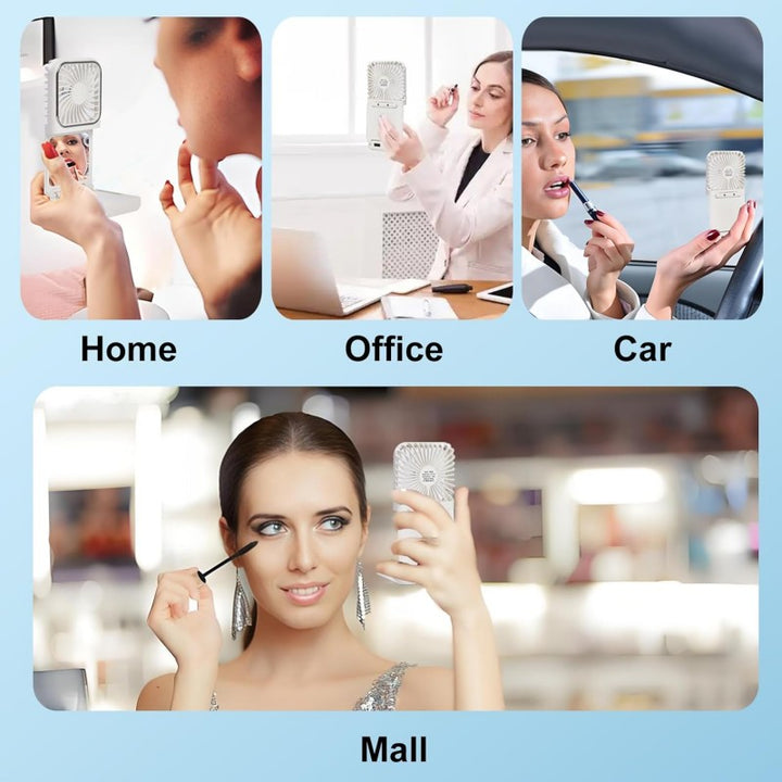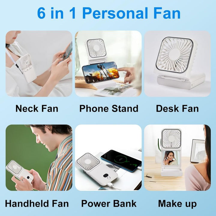 Mini ventilador portátil 6 en 1 como banco de energía, espejo de maquillaje, soporte para teléfono, ventilador de mano