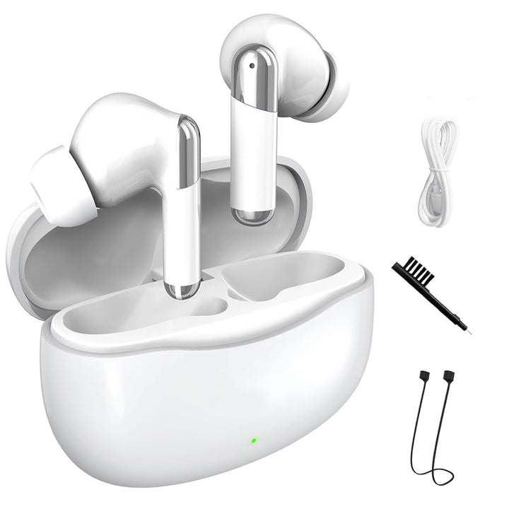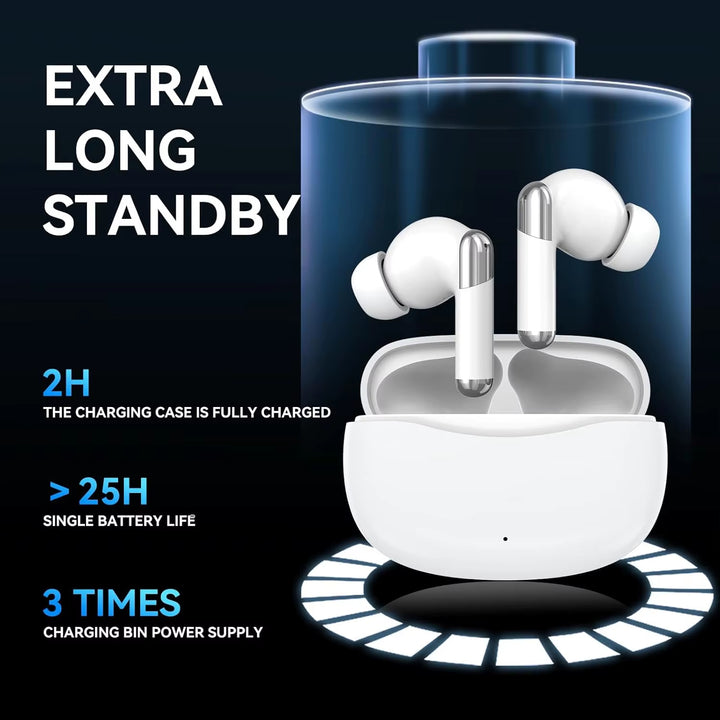 🔋 Energía recargable de larga duración: Carga tipo C Comodidad: ¡sin necesidad de cambiar la batería! 16 horas por carga + ~70 horas extra del compacto Estuche de carga portátil . Listo en solo 2 horas (retira primero la pegatina aislante).