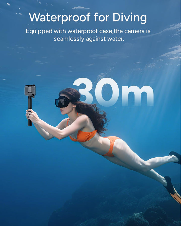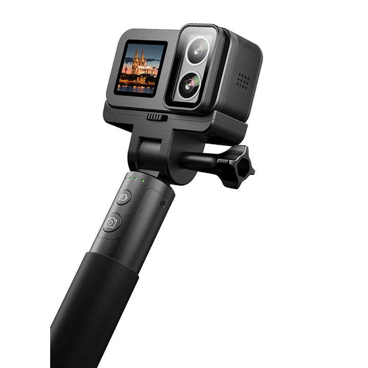 Incluye Palo selfie con batería externa incorporada (¡8 horas de autonomía!). La batería de 1100 mAh de la cámara dispara. Más de 120 minutos en 4K y admite grabación mientras se carga: nunca te pierdas un momento. -