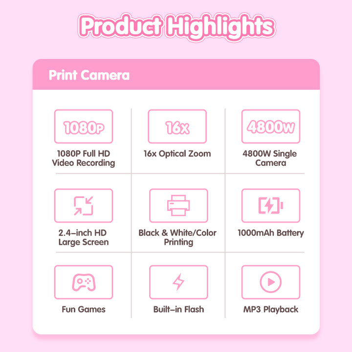 Photography + 1080P HD Video + Instant B&W Printing + Games + Music + Fun Frames + Flashlight + Timer! Spark endless creativity and fun.