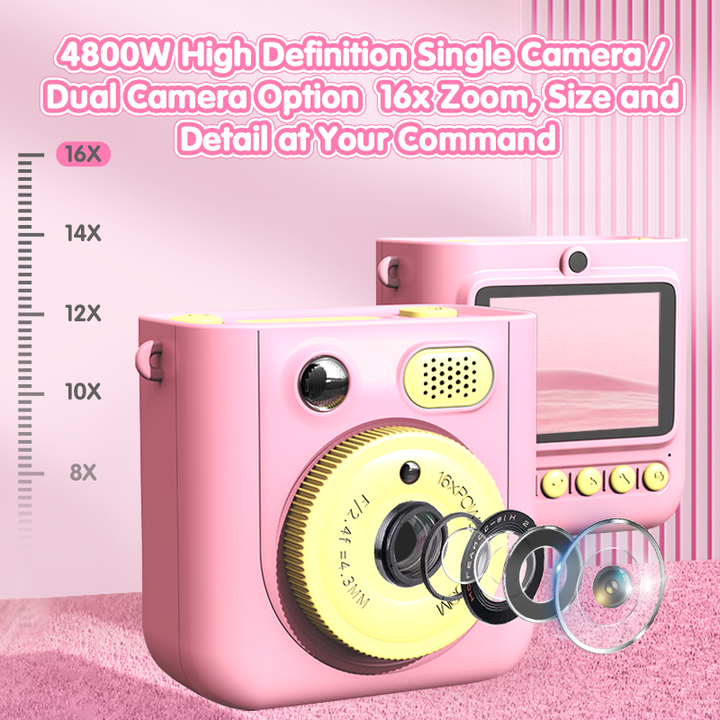 12MP HD lens + 2.4" Color Screen + 16x Zoom! Perfect for capturing adventures with vibrant detail. Continuous & timer modes for every smile.